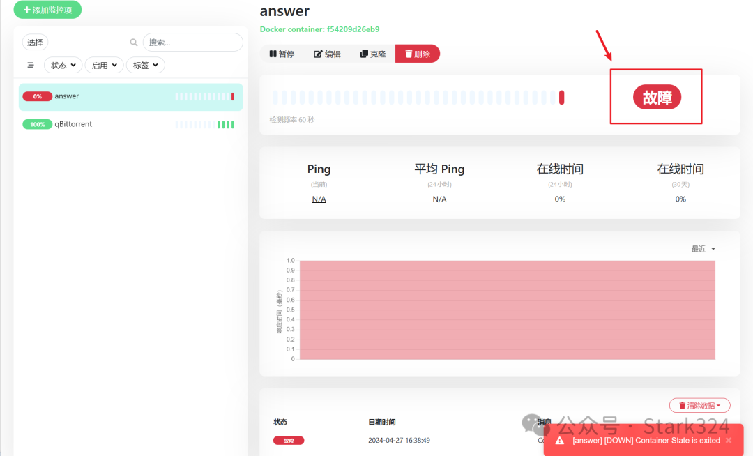 🔺我特意将一个监控正常的Docker容器停掉一个,它这里很快就提示“故障”。