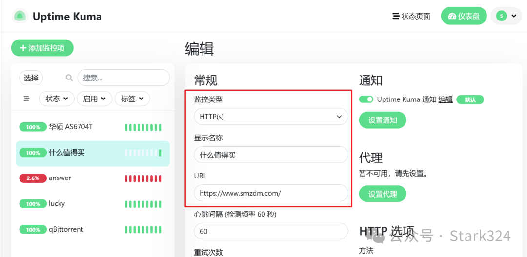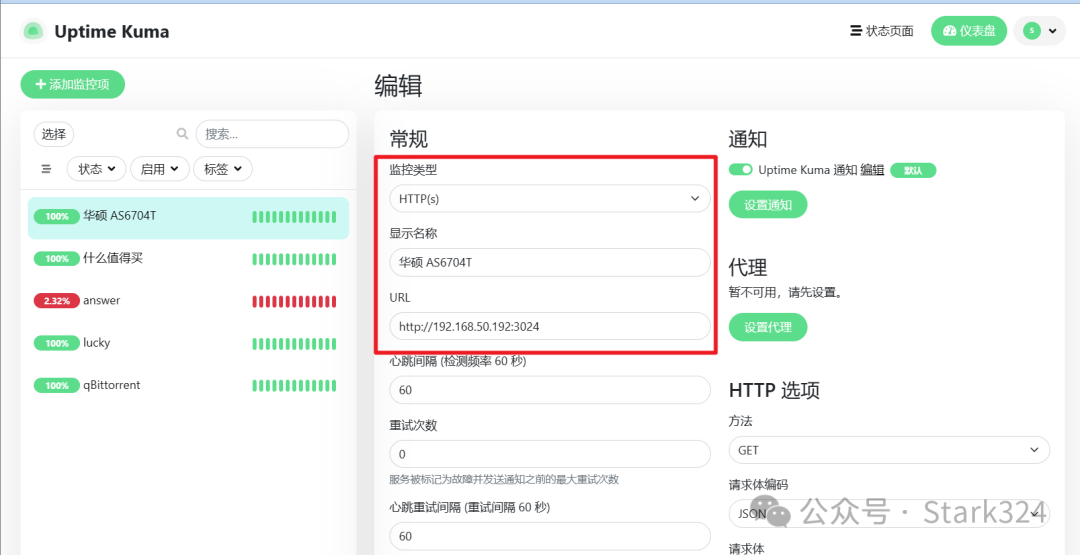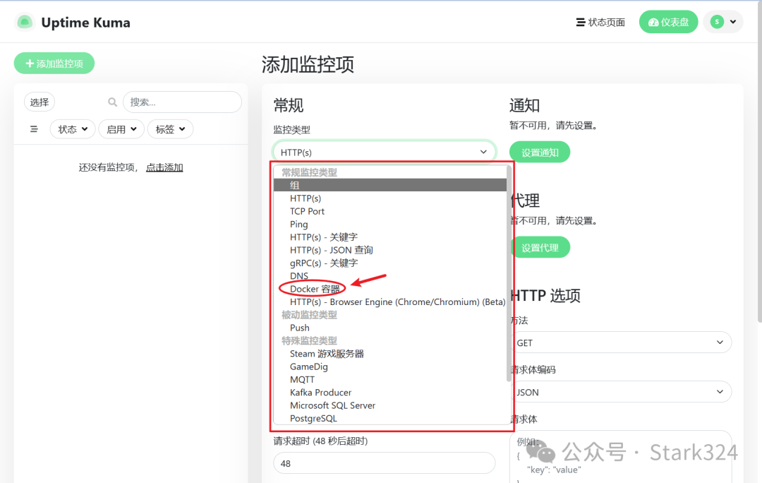 🔺在设置监控项页面,可以看到它支持的监控类型非常多,除了以HTTP(s)打头的网页,还包括Json 查询 / Ping / DNS / 数据库 / 游戏库等多种监控类型,以及对于我们NAS用户来说最实用的Docker容器监控。
