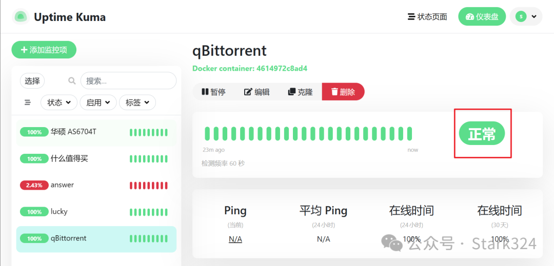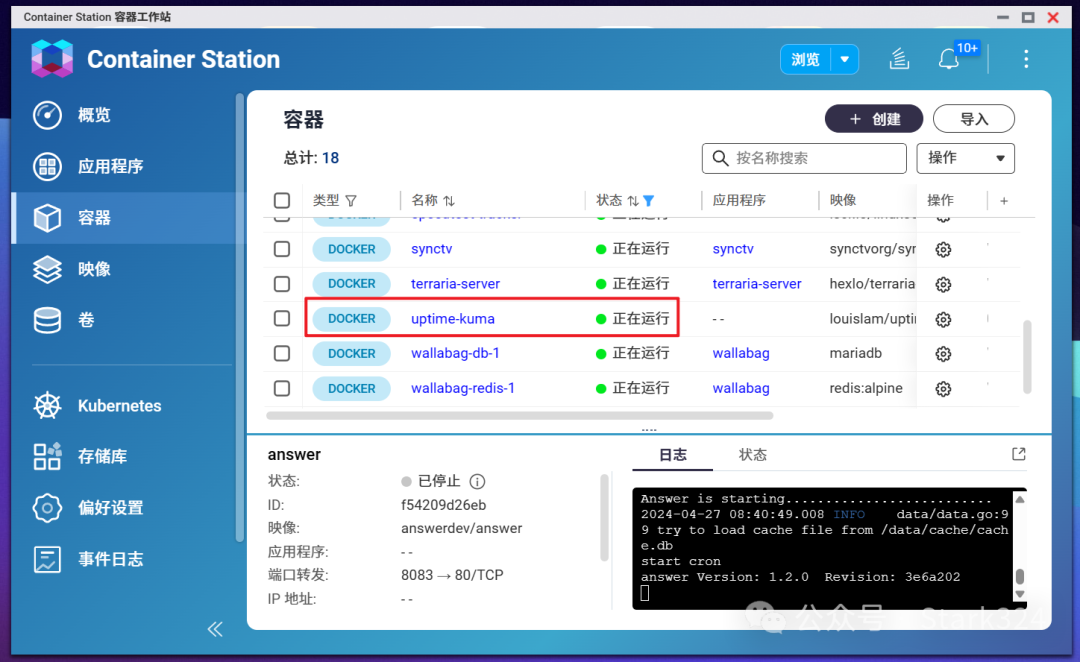 🔺如果没有问题在NAS的Docker容器列表中就能看到uptime-kuma容器已经正在运行了,说明部署成功。