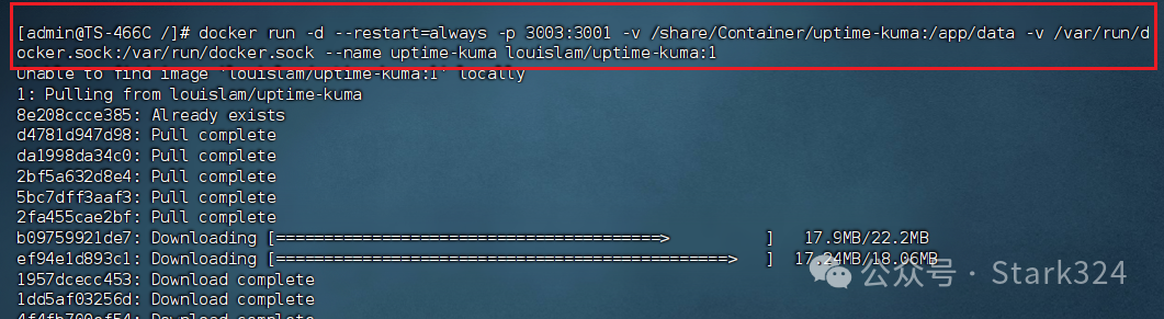 🔺接着使用SSH终端工具连接到NAS之后先启用root模式(“ sudo -i ”),接着直接输入以下Docker run命令: