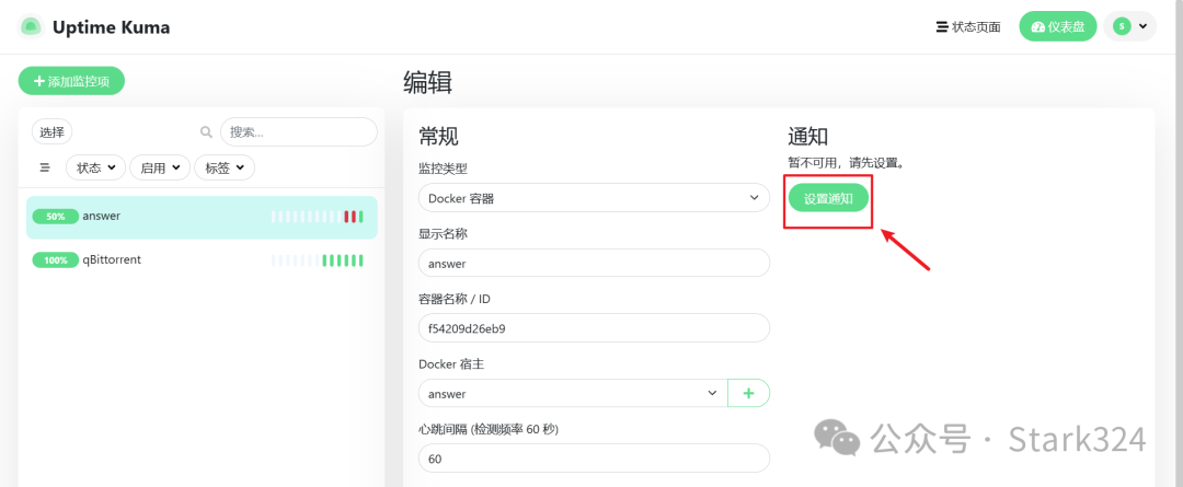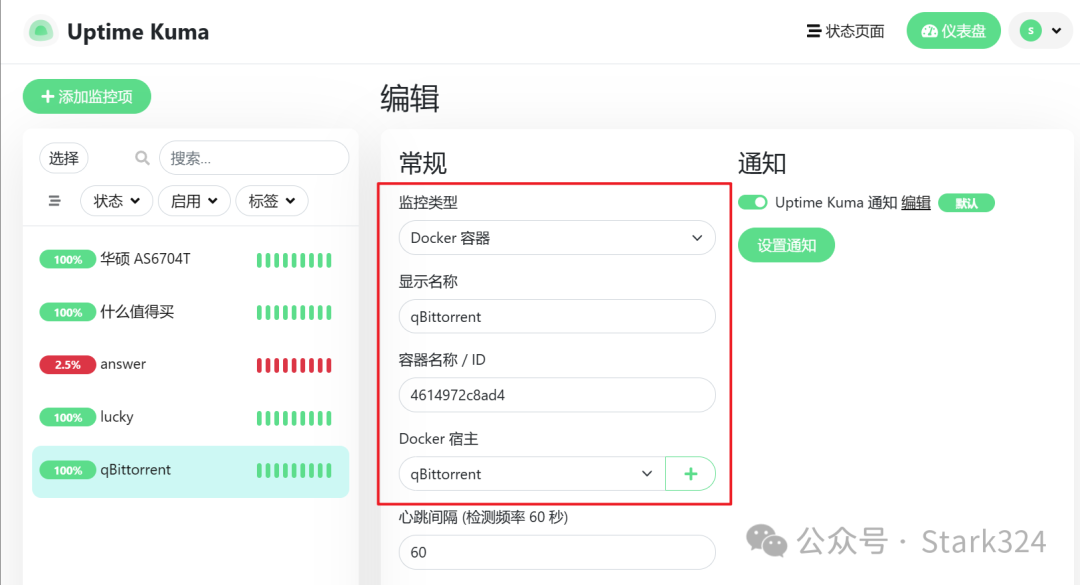 🔺比如说我想要监控NAS本机的qBittorrent容器,其实我们需要设置的也就上图所示四个地方即可。这里有个我没搞明白的事我如果直接输入容器名称它会提示错误,而输入容器对应的ID就完全没问题了。