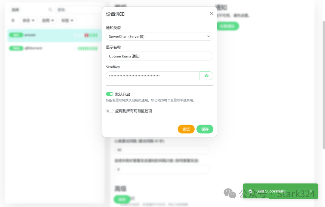 🔺我这里演示使用微信端的Server酱来作为通知,只需将Server酱那边的SenKey粘贴过来即可,还是很简单的。