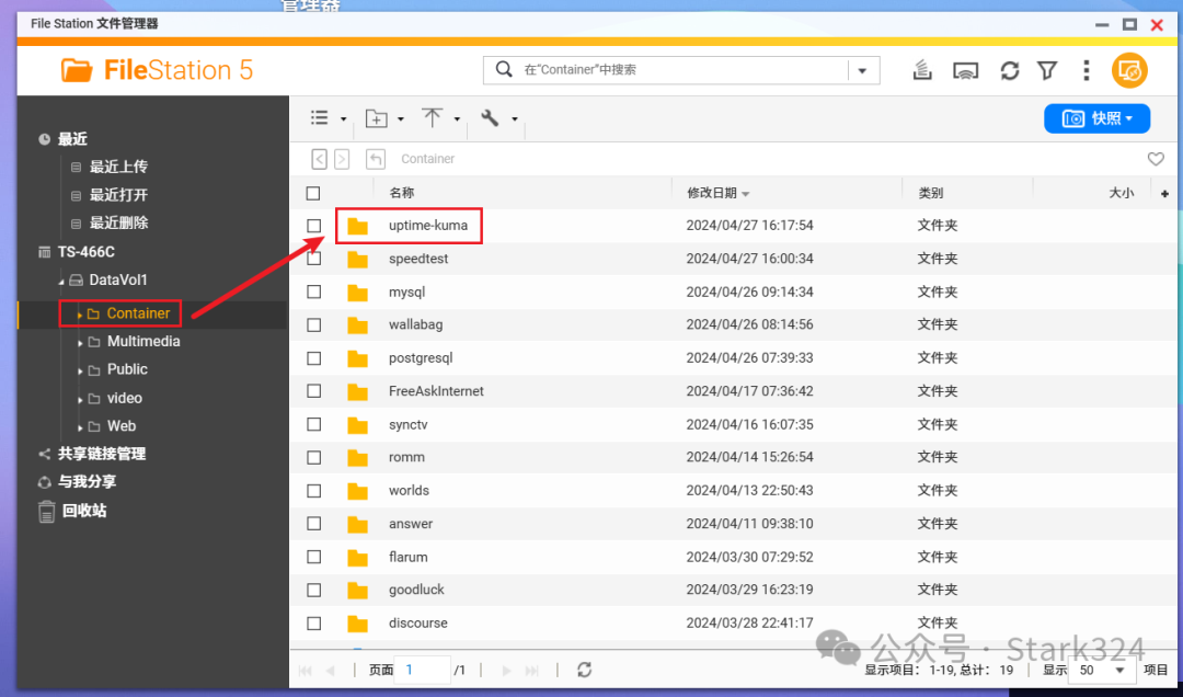 🔺老规矩,为了数据持久化,我们需要提前在建立一个对应的目录映射。打开NAS的文件管理器,在 docker 目录中(威联通默认为Container文件夹),创建一个新文件夹【uptime-kuma】。